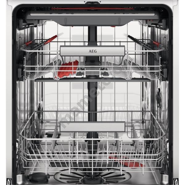 Horní košík má 2 skládací držáky, 2 skládací drátěné držáky pro skleničky, 2 měkké špičky, 6 měkkých špiček pro vinné sklenky, skládací poličky na šálky, nerezové držadlo AEG, boční úchyty koše