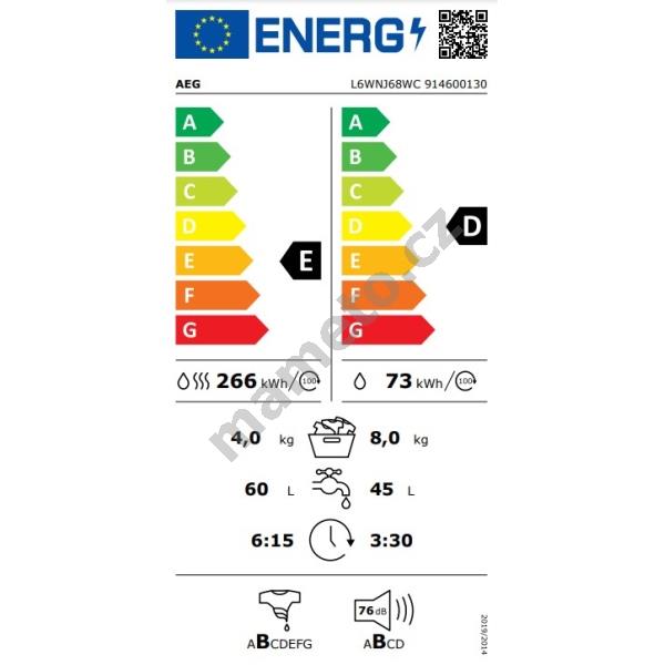 Prací programy: Eco 40-60, bavlna , syntetika, jemné prádlo, vlna , 20 min. - 3 kg, odstřeď./vypouštění, máchání , vlna suché do skříně , Delicate Dry, Synthetic Drying, bavlna suché do skříně , NonStop 1h/1kg, pára - osvěžení