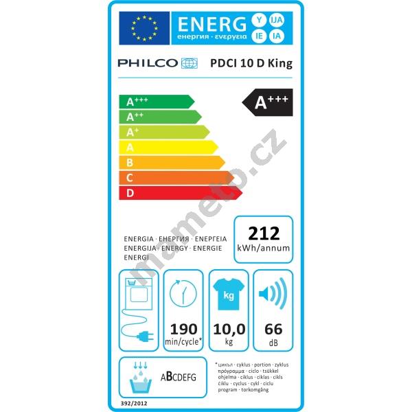 Kondenzační sušička s tepelným čerpadlem Philco PDCI10D King, v energetické třídě A+++, je určená pro sušení 10 kg prádla. Tato senzoricky řízená, svého druhu jedna z nejúspornějších sušiček na trhu, je vybavena Invertorovým motorem s 10letou zárukou, funkcí Hygienické pro vyšší sterilitu prádla, nebo možností připojit sušičku na odpad vody. Funkce na snížení pomačkání prádla AntiCrease, program Můj program, který umožňuje trvalé uložení nejčastěji používaného programu s Vámi předdefinovanými parametry. Pro věžové uspořádání této sušičky s pračkou řady King lze použít mezikus KIT 59, pro šetrné sušení vlny držák PDH 8.