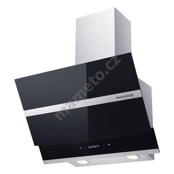 Komínový odsavač PEW726B, skleněný černý design s nerezovým pruhem, nerezový komín, třída energetické účinnosti A