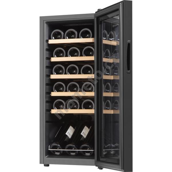 Vinotéka pro 18 láhví vína Energetická třída G Rozsah teploty: +5 až +18°C LED osvětlení Displej Dřevěné police Senzorické řízení provozu Chlazení kompresorem Automatické odmrazování Nastavitelné nožičky Zámek ovládacího panelu Hlučnost 43 dB Roční spotřeba energie 120 kWh Klimatická třída N Rozměry (VxŠxH): 77 x 34,5 x 45 cm